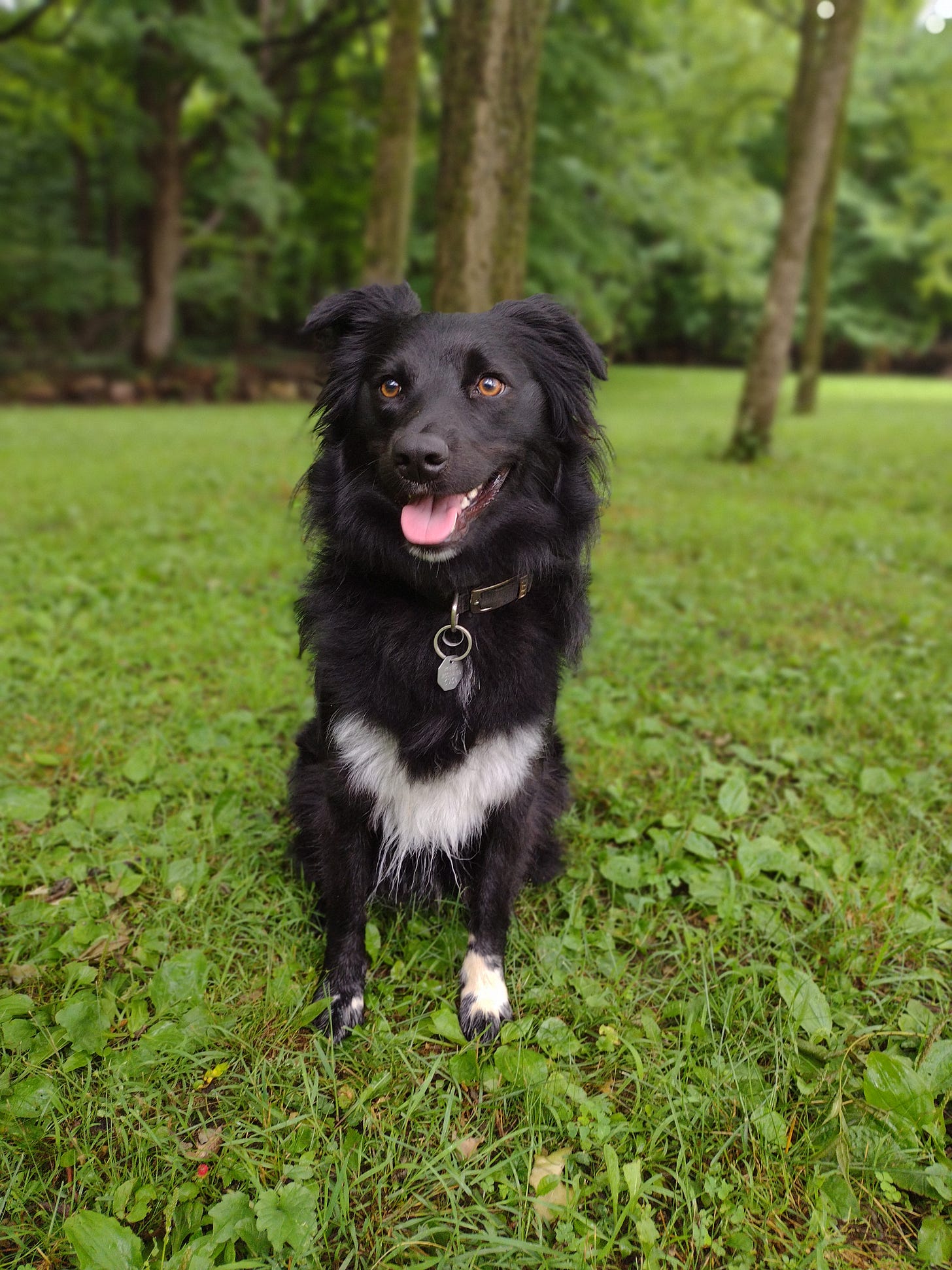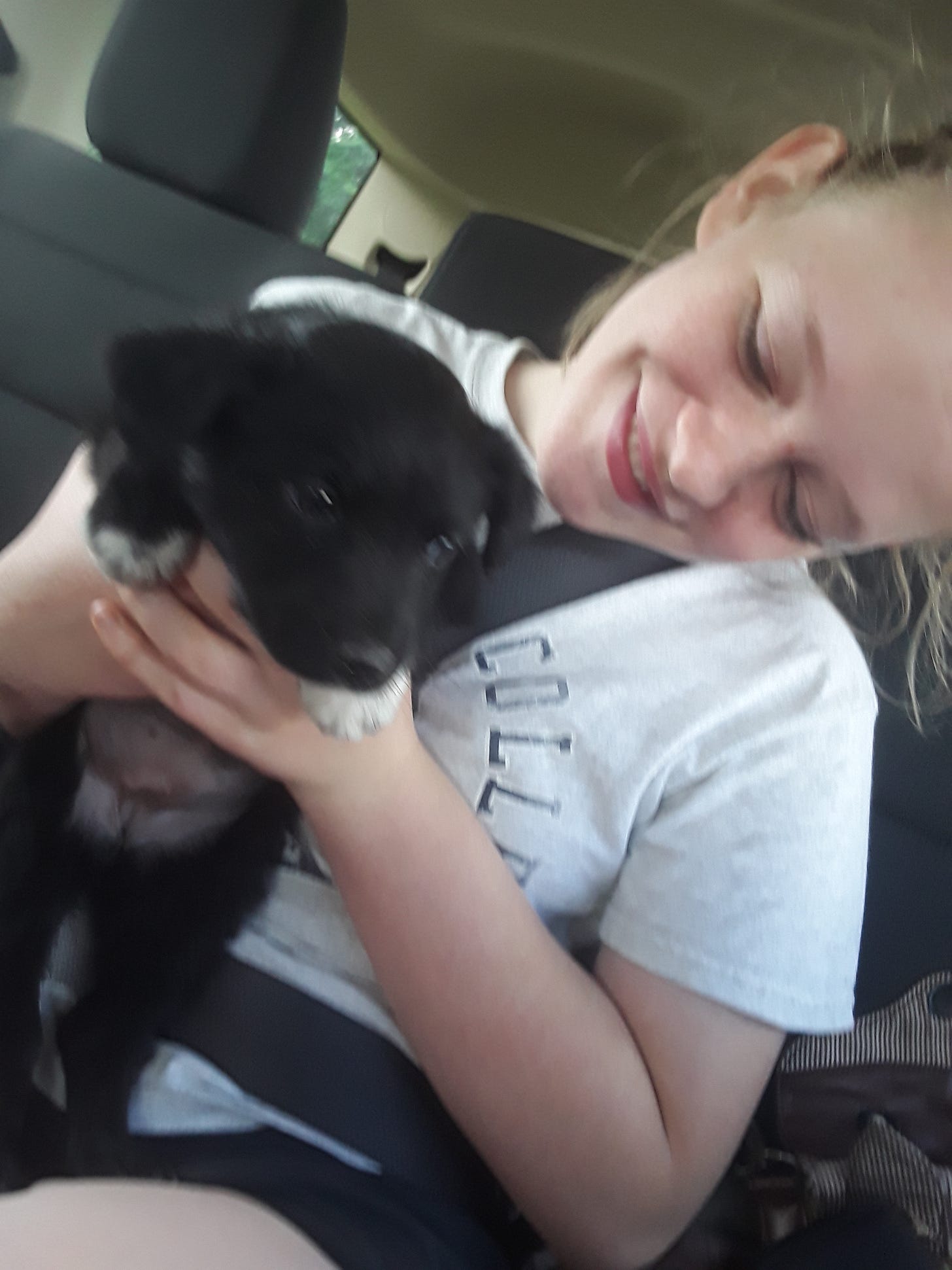 The car rolled into the driveway, gravel crunching underneath the wheels. I impatiently waited to see the puppies. Coming to a stop, my sister, mom, and I eagerly jumped out of the car. When we got to the house the lady appeared and welcomed us. She showed us the litter of puppies. I could not contain my excitement. But which puppy should be brought home? They were all so precious, how could we choose? As we looked at the puppies, one caught our eye. Her fur was dark as night, her small ears flopped over, the tips of her too large for her paws were painted white, and on her front chest was a patch of white fur that formed the shape of a heart. We knew she was the one.